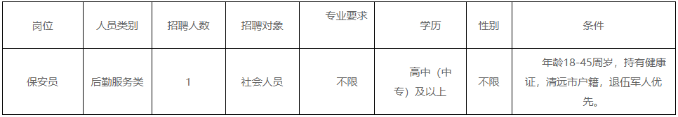 清遠市清城區(qū)機關(guān)事務(wù)管理局因工作需要,根據(jù)《關(guān)于印發(fā)<清遠市清城區(qū)機關(guān)事業(yè)單位專項工作聘員、合同制聘員以及后勤服務(wù)類人員管理辦法>的通知》(城區(qū)人社[2022]20號)文件精神,面向社會公開招聘后勤服務(wù)類人員1名,現(xiàn)將有關(guān)事宜公告如下: