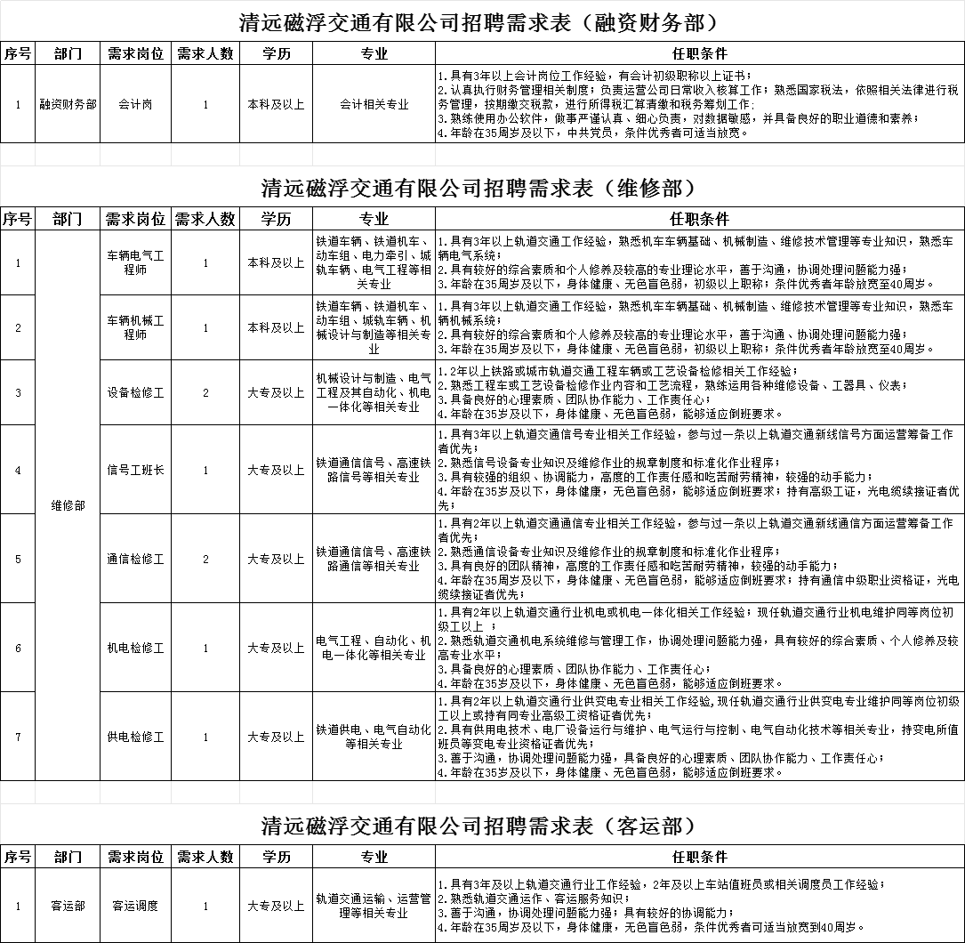 2、資料提交:應(yīng)聘人員下載填寫附件《清遠(yuǎn)磁浮交通有限公司招聘報名信息登記表》連同身份證、學(xué)歷證、職稱證、專業(yè)技術(shù)資格證等報名資料壓縮打包后發(fā)送至電子郵箱qycf_zp@163.com;郵件名稱請按“應(yīng)聘崗位+姓名+專業(yè)”格式命名。